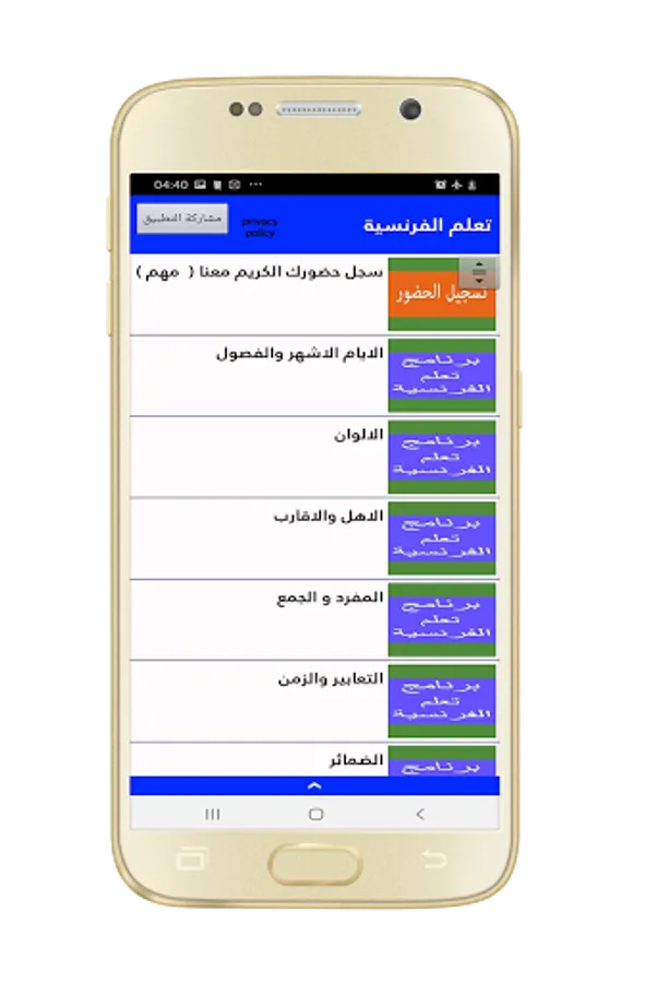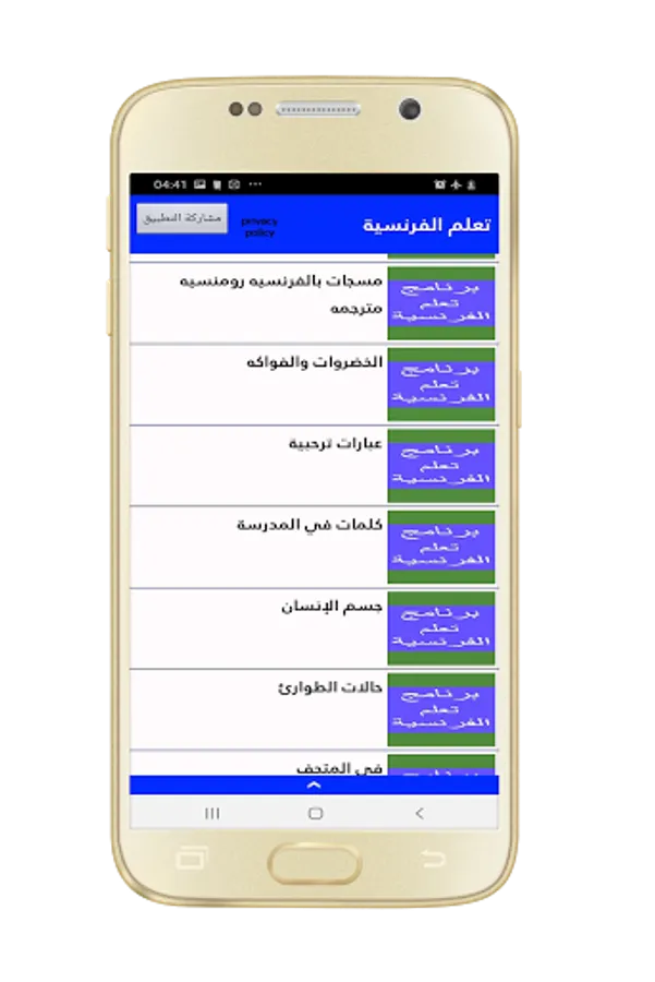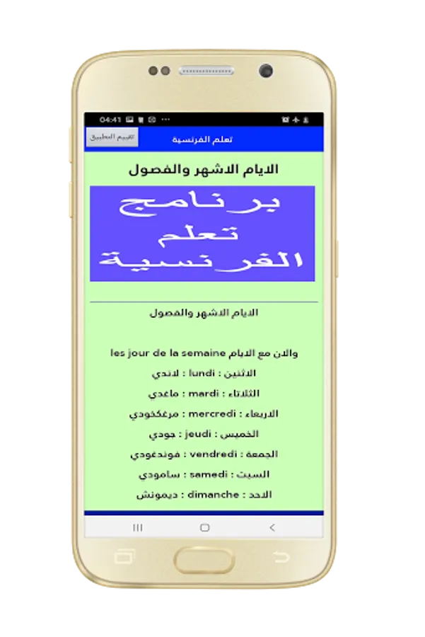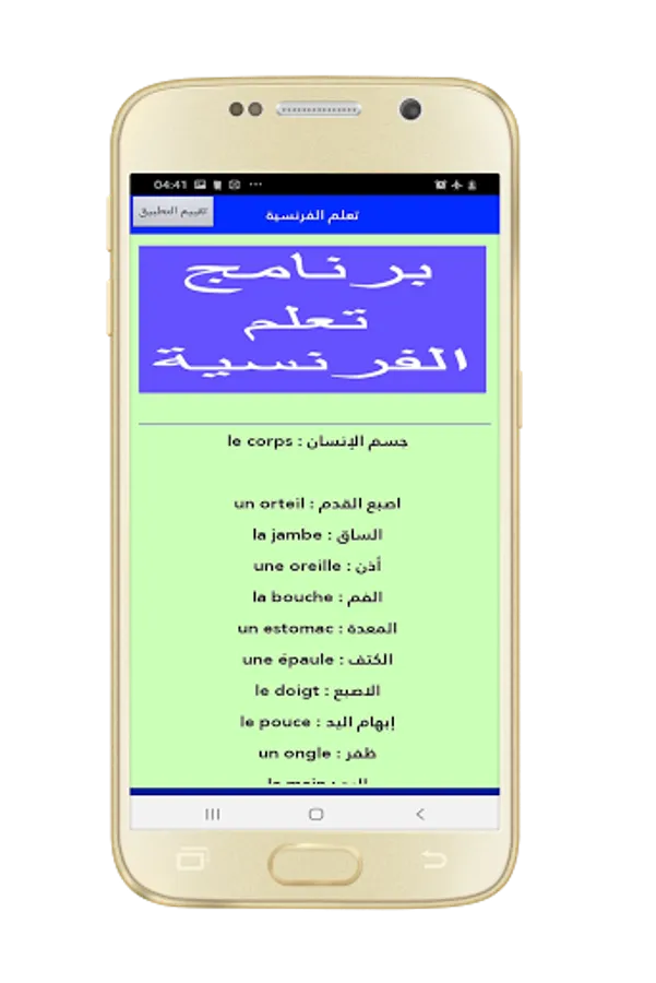 إضافة الى ذلك يحتوي البرنامج على العديد من الدروس وذلك عن طريق ترجمة عربي فرنسي بدون انترنت مما يجعلكم قادرين على الفهم السريع للغة الفرنسية بالنسبة للذين يبحتون على التطبيق باستعمال عبارات مختلفة فيمكنهم ذلك عن طريق استعمال العبارات الموجودة اسفله : تعليم اللغة الفرنسية بالعربية ,ترجمة فرنسية عربية