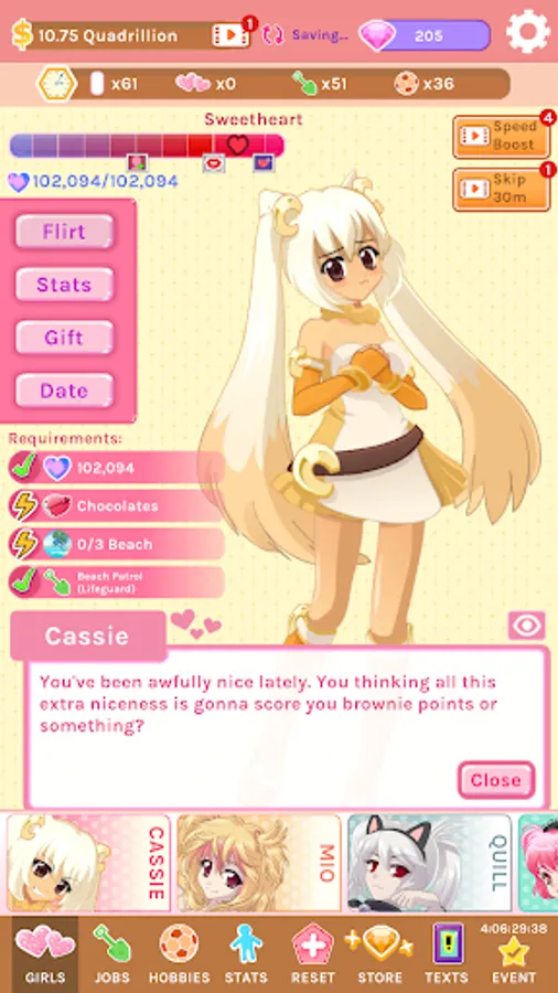 Match with hot anime girls and have fun flirting your way to romance. Chat with your crush and go on dates with fun female friends who are looking for love. Earn cash with idle jobs and hobbies to improve your chances with these lovely ladies. Buy your lover gifts and outfits to boost their affection toward you. Unlock photos and dialogue prompts as your love grows!