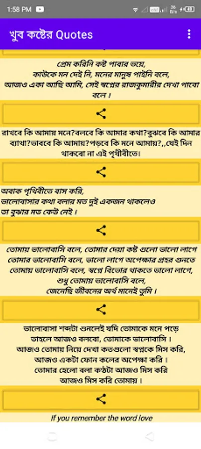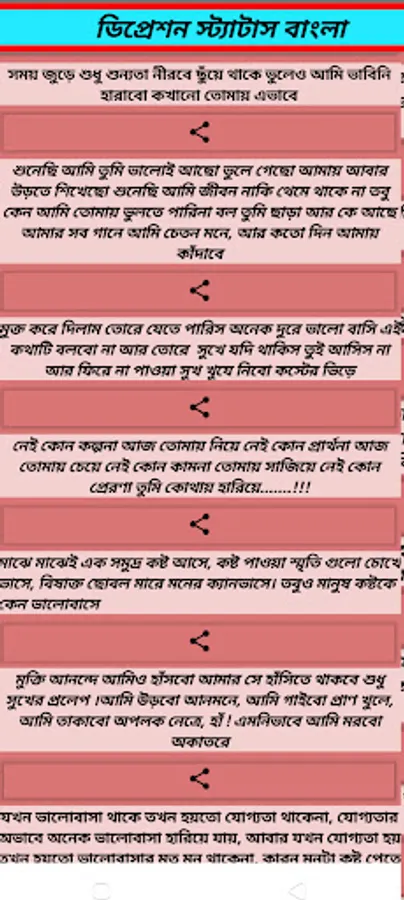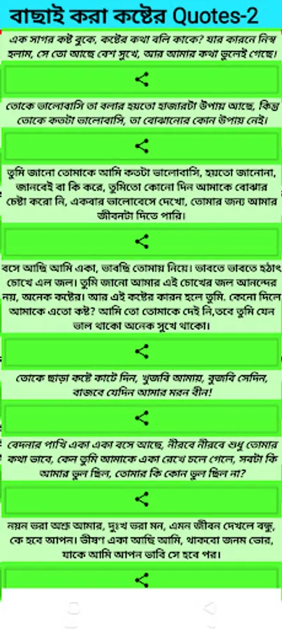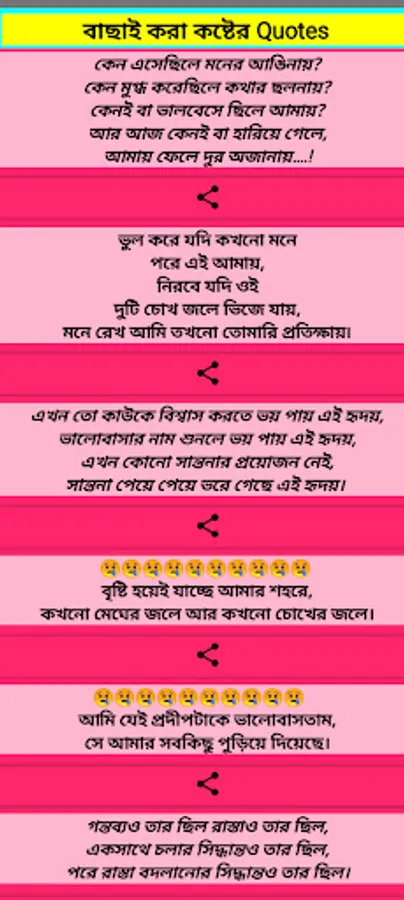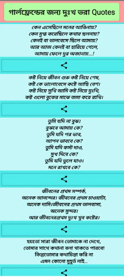 In this app we upload per day bangla sad quotes, shayari,sad sms,brakeup quotes,Alone Quotes.From this app you can easily find all kinds of Sad Quotes ,Shayari,sms. These can be shared with everyone. Completely free and it work without internet.