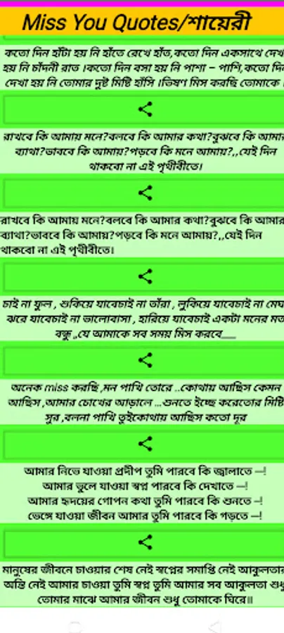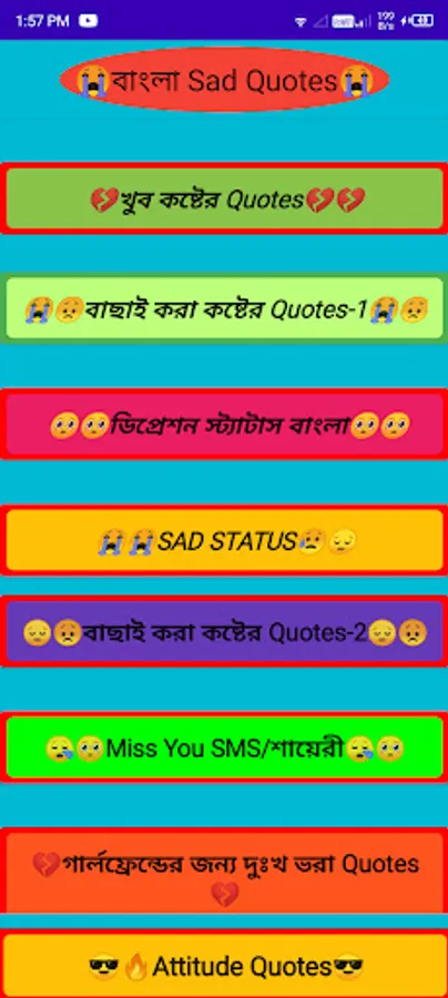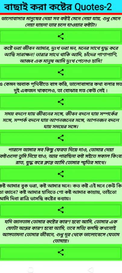 এই অ্যাপ থেকে সব রকমের সবধরনের ভালো Sad Quotes-Sad Shayari খুব সহজেই পাওয়া যাবে | এগুলি আপনি সবার সাথে শেয়ার করতে পারবেন |সম্পূর্ন ফ্রি এবং বিনা ইন্টারনেটে চলবে |