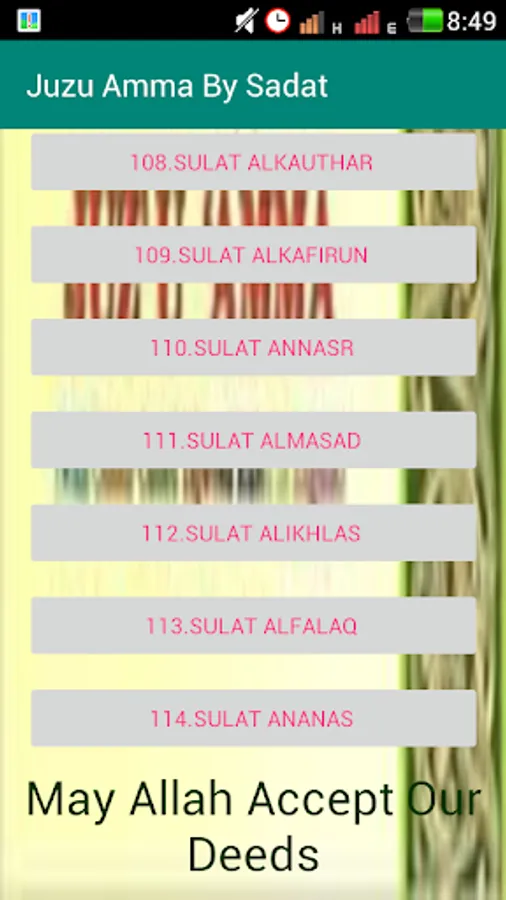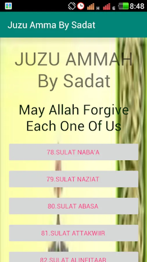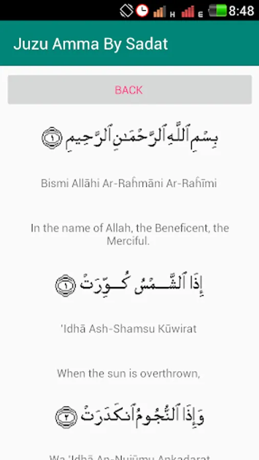 This application contains Juz Amma (Last chapter of the Quran from Surah 78 to Surah 114) and Al-Fatiha. Each sura is displayed with its original verse (in arabic) and also with its translation and transliteration.