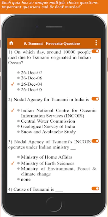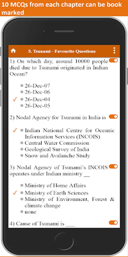 App covers 260 MCQ (Multiple Choice Questions) on Environmental issues and disaster management that includes Current Affairs on disasters and disaster management.