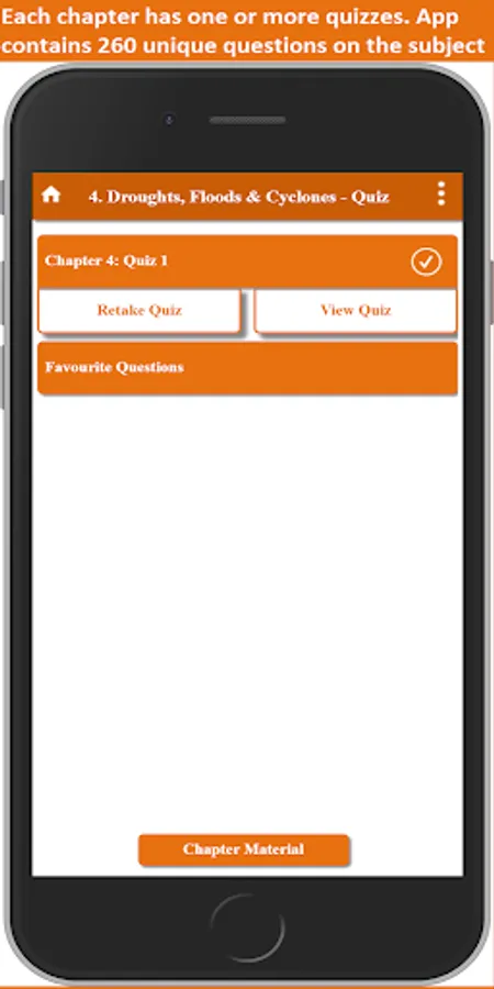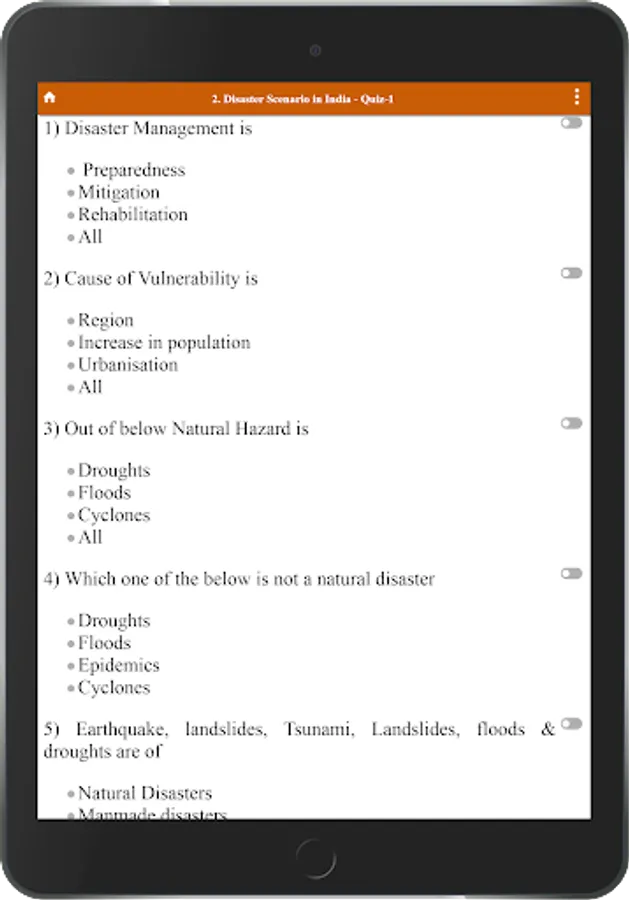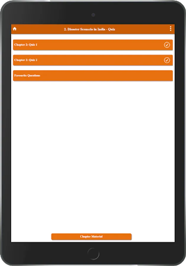 Apps screens are designed such that easy navigation is maintained between study material, quiz, review attempted quiz & view book marked Favorite objective questions on Disaster Management.