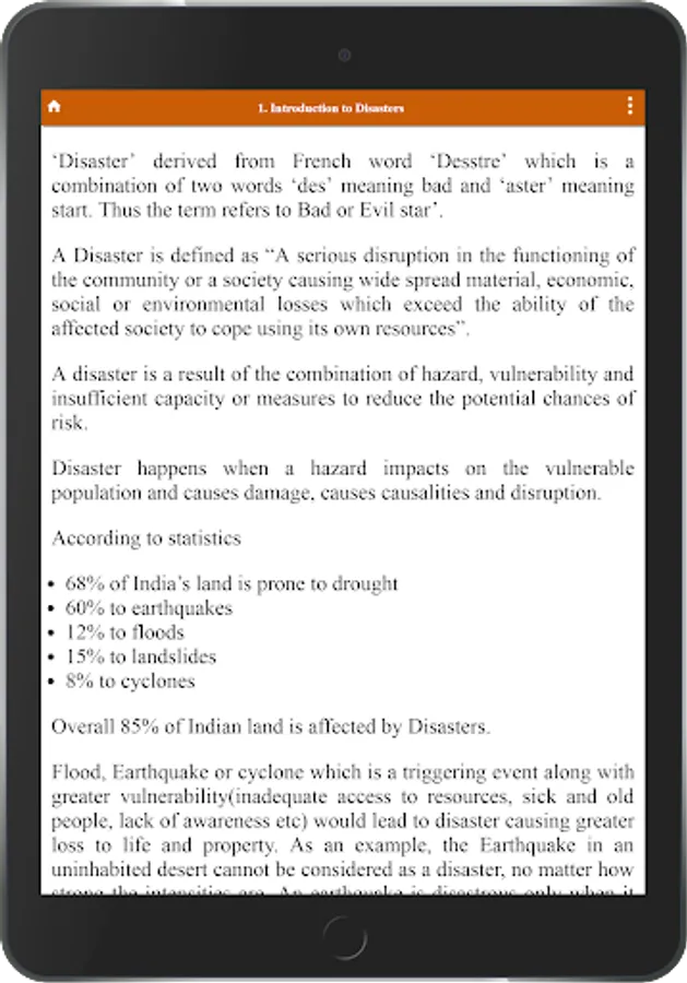 This app explains Hazard, natural hazard, manmade hazard, vulnerabilities such as physical vulnerability and socio-economic vulnerability.
