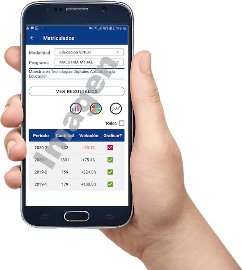 • Graph in Bar, Circular and Linear format the data that you consider necessary, previously selected according to the academic period.