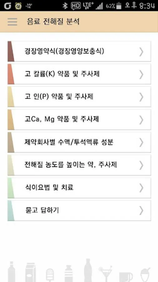 또한 부종 및 고혈압환자를 위한 나트륨 성분 관련 정보, 당뇨병환자 및 비만 환자를 위한 당과 칼로리(열량)관련 정보, 만성신부전 환자 및 통풍 환자의 요독 악화 및 요산 상승 등과 관련하여, 단백질 음료는 단백질, 아미노산 성분까지 제공하여 만선신부전, 고혈압, 당뇨병 등의 질환에서 음료와 음식에 관련된 중요한 정보를 제공한다.