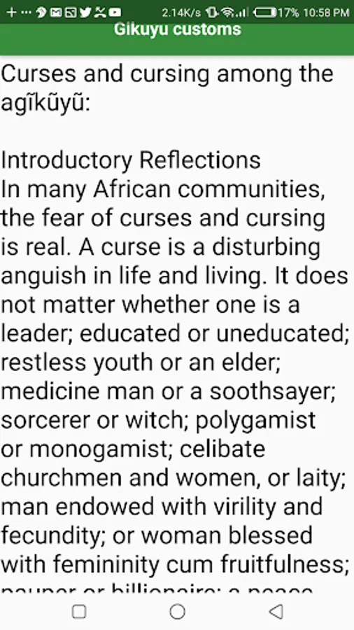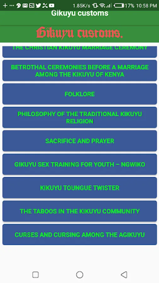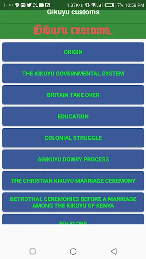 Get an offline easy to read app informing about the traditional customs ,religion and Taboos of the Kikuyu tribe of Kenya.