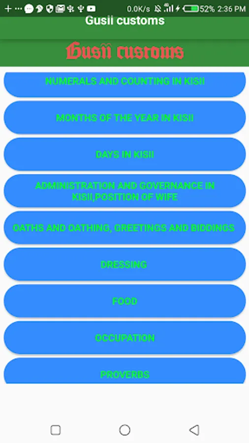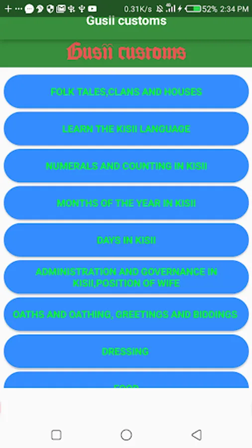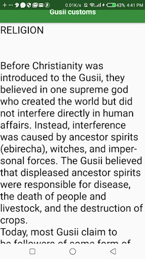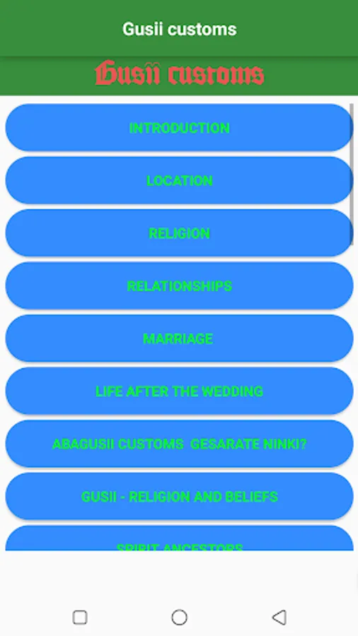 The app has a lot of information about the traditional customs ,religion and Taboos of the Gusii tribe of Kenya.