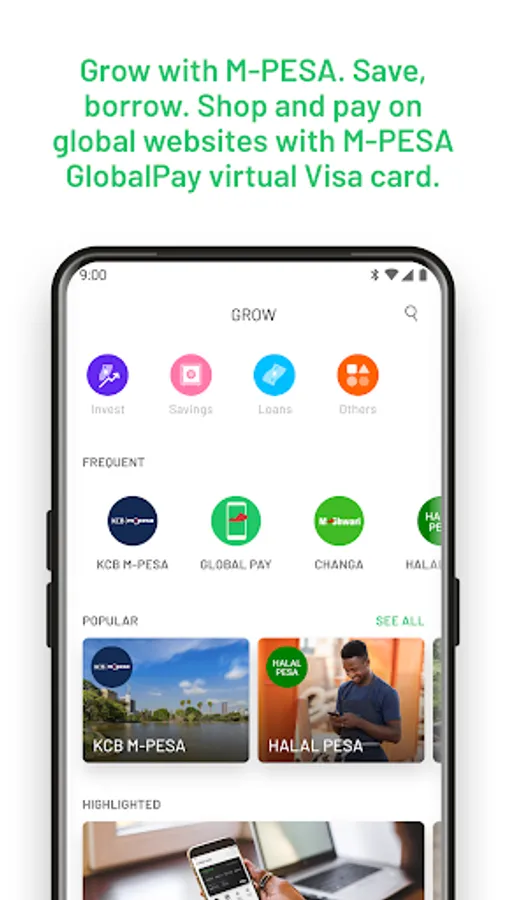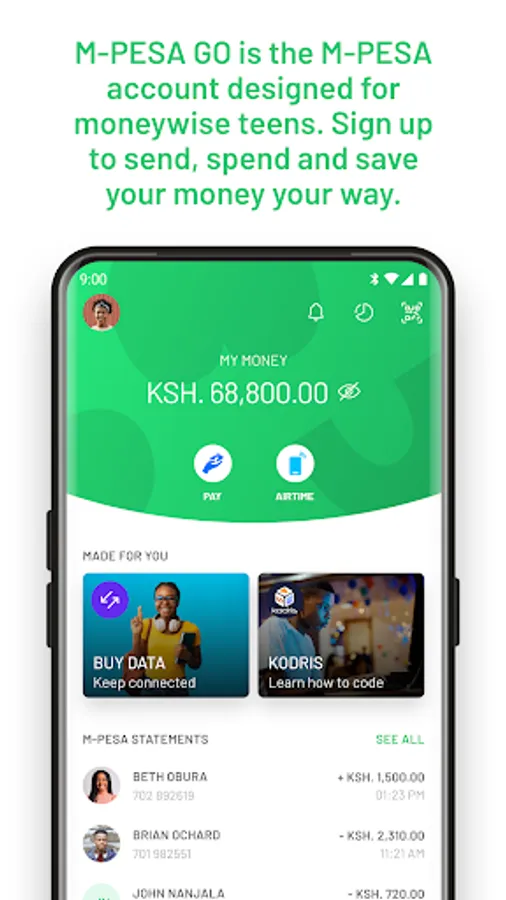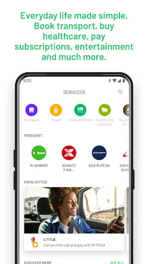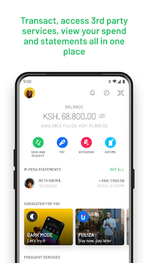 • Core M-PESA transactions - Access all core M-PESA transactions with a brand new and more simplified user experience - Send money, buy goods, pay bill, withdraw at agent and buy airtime