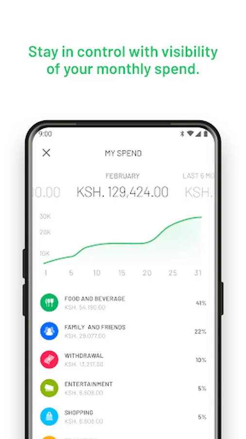 • My Spend - Allows the user to track their M-PESA spend per month with aggregate and daily average spend displayed on the card on the home screen as well as a more detailed view with transactions broken down by category with the user being able to change their category