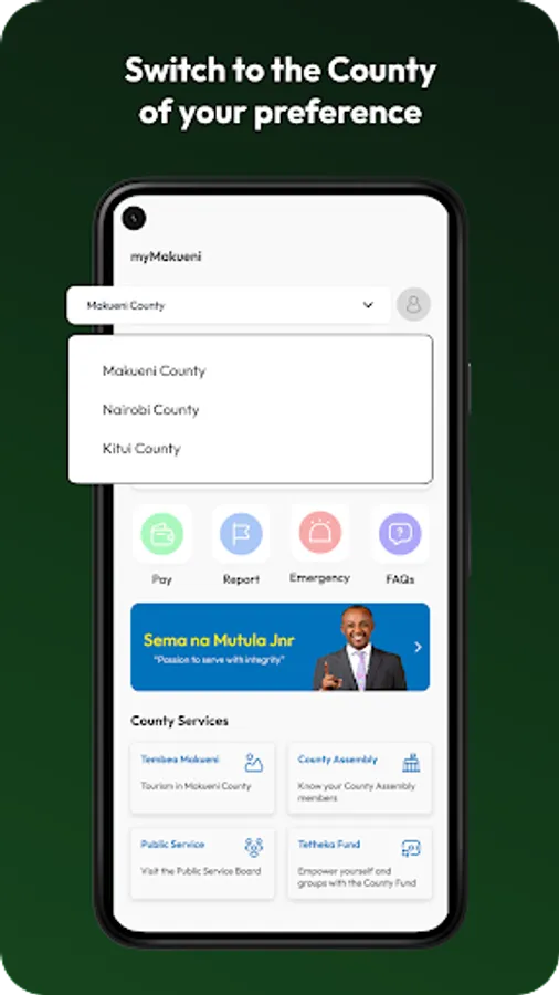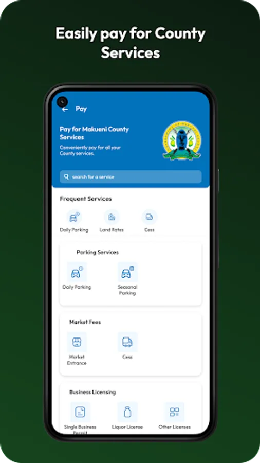 i. Standardized Experience: Through MyCounty app channel as a single point of entry, users will have access to their resident county features such as paying for county services including but not limited to parking, single business permits, land rates and market cess fees among others.