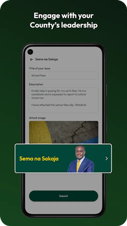 iv. Users Engage Governors: In addition, users will also be able to engage their respective counties through “Sema na Governor” feature which simply means speak to the governors and gives a chatbot feature where users can engage their county leadership on various matters.