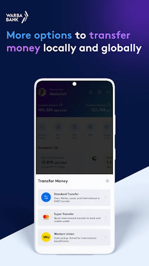 • Transfer money locally and internationally via SWIFT, Super Transfer, or Western Union.
