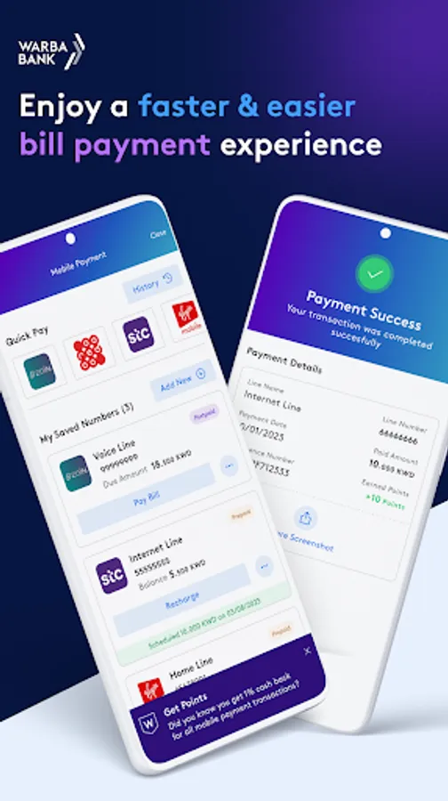 • Earn points by using credit cards, paying bills, transferring salary, or inviting friends to open an account with Warba.