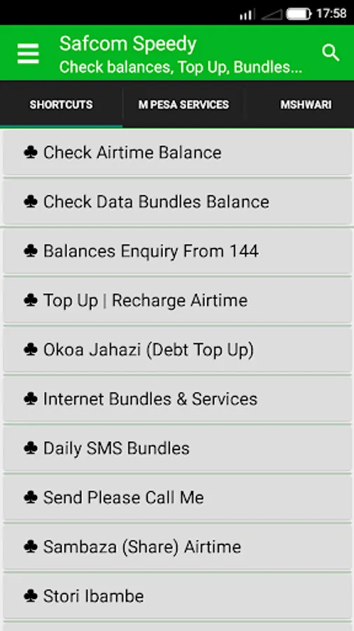 Safcom Speedy App is a free cool app for Safcom users for speed dialing of *USSD# Service Codes, M Pesa Costs & Calculator , MShwari plus others services through a user friendly interface and by just a button click.