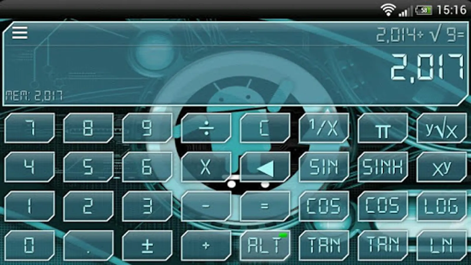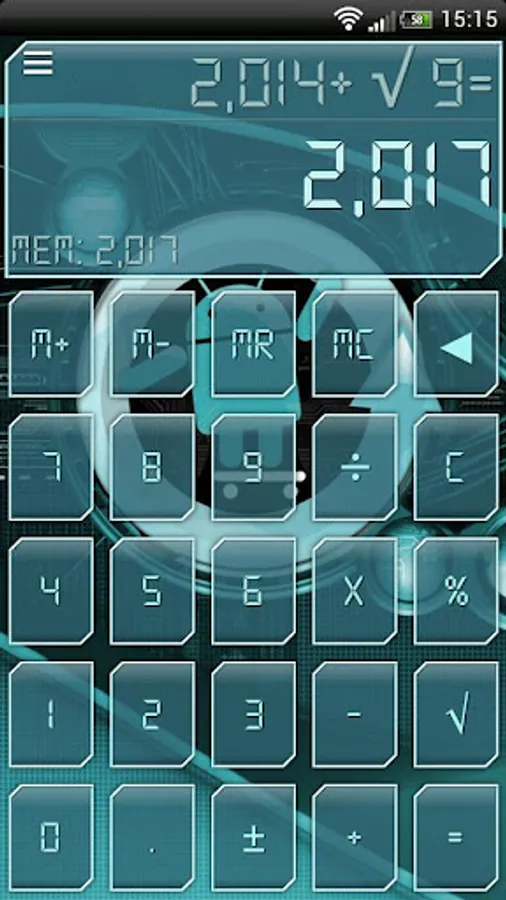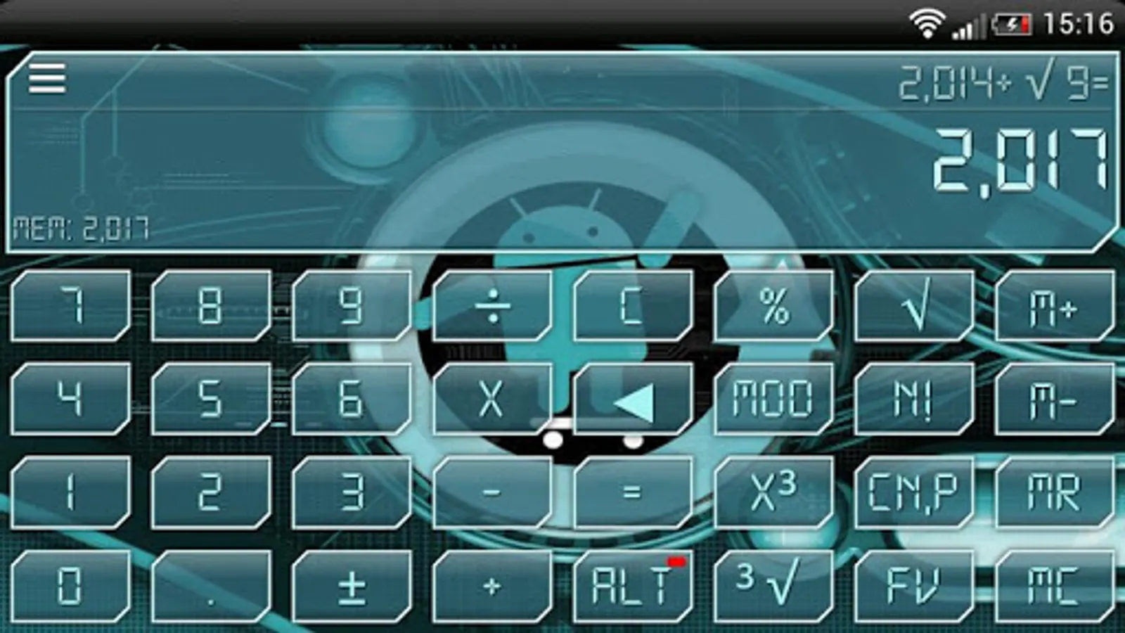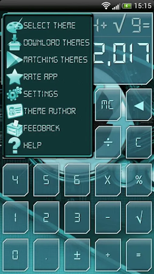 CYANOGEN Theme for Skinnable Calculator, change skin, wallpaper and font. Themes for the Skinnable Calculator can be downloaded from the Play Store.