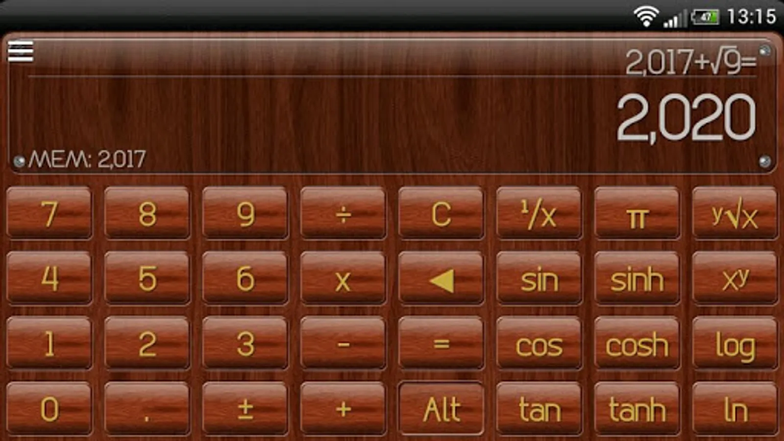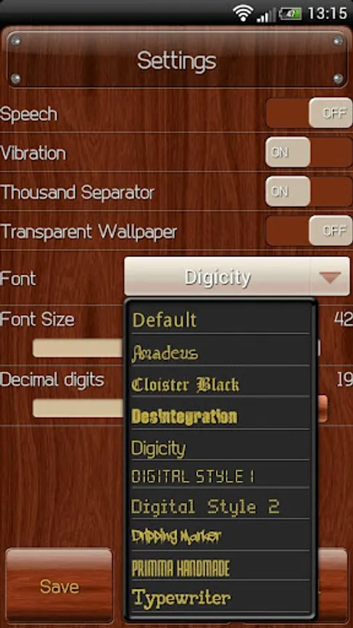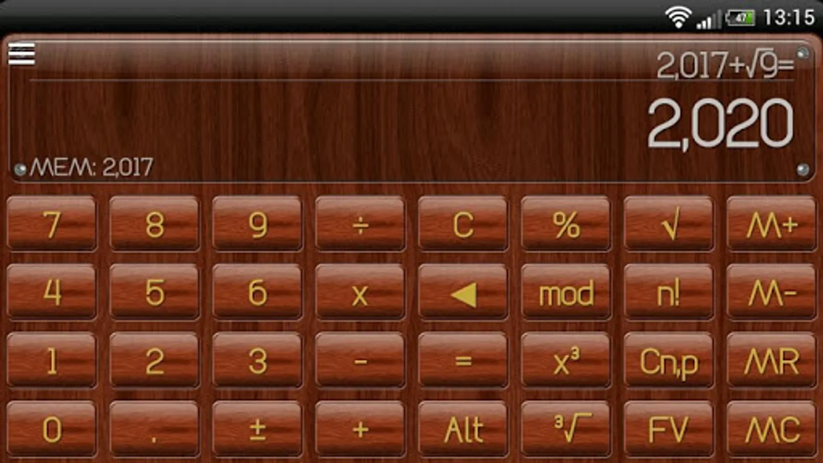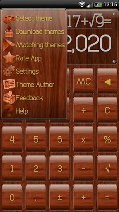 Mahogany Wood Theme for Skinnable Calculator, change skin, wallpaper and font. Themes for the Skinnable Calculator can be downloaded from the Play Store.