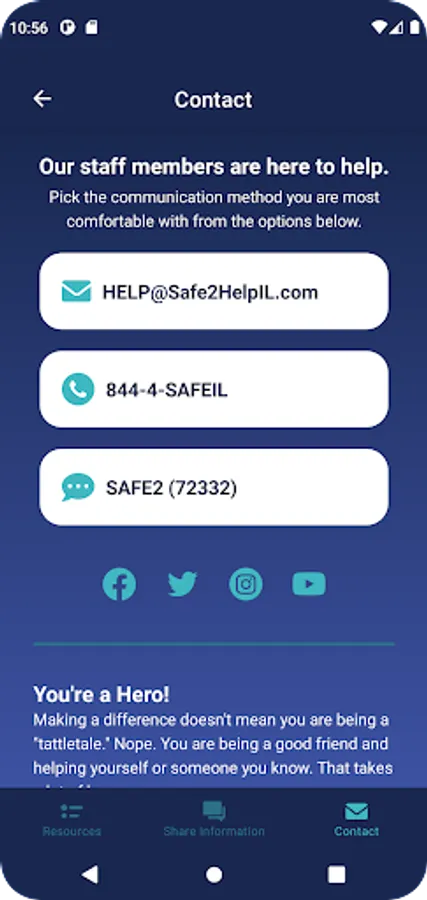 The Safe2Help Illinois app Safe2Help Illinois provides self-help resources for students and a way to share information with our 24-hour a day 7-day a week call center.
