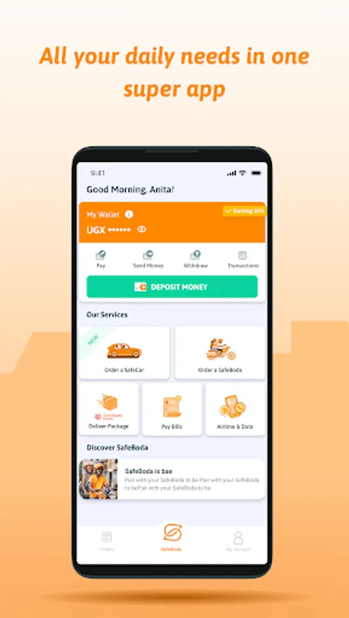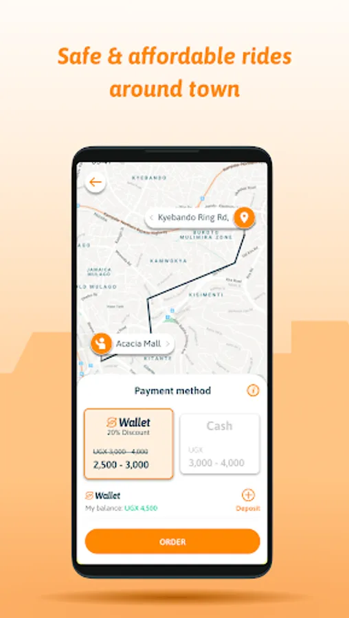 Deposit to your SafeBoda Wallet using mobile money/card, with a driver, or at an agent location, and enjoy cashless rides all the way.