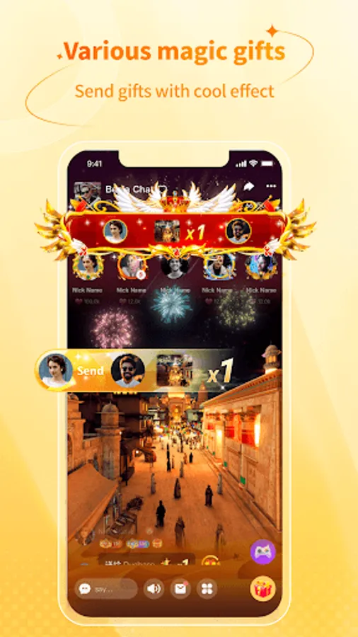 We designed various of beautifu gifts with effect and voice. You can send them in the room to active the room and share the fun with friends.