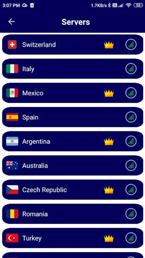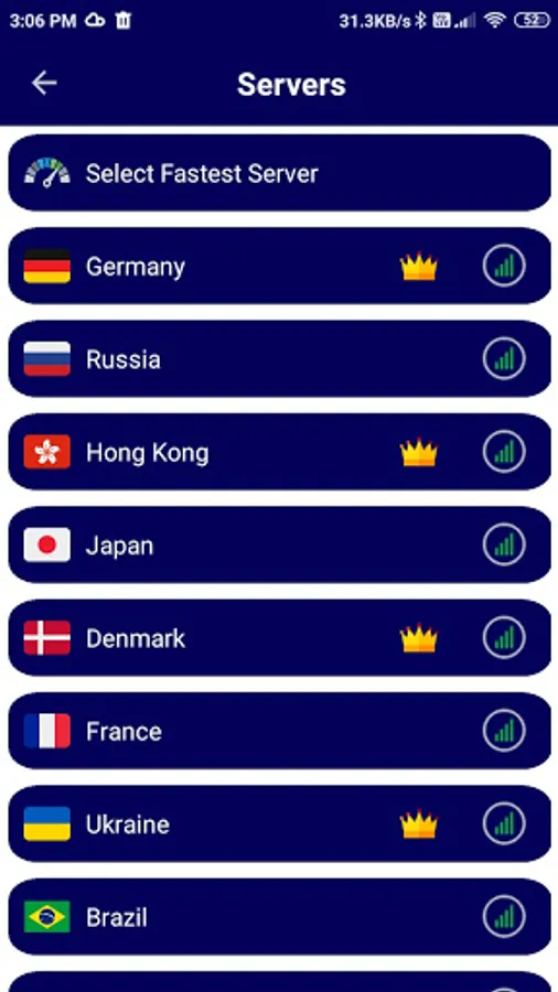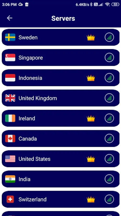 location (no need to close the existing connection first). The app can also select the best performing server for you automatically