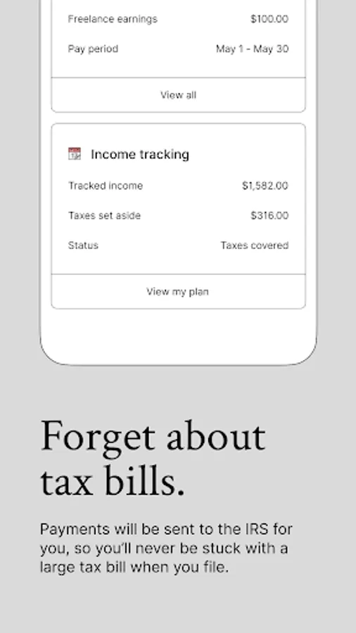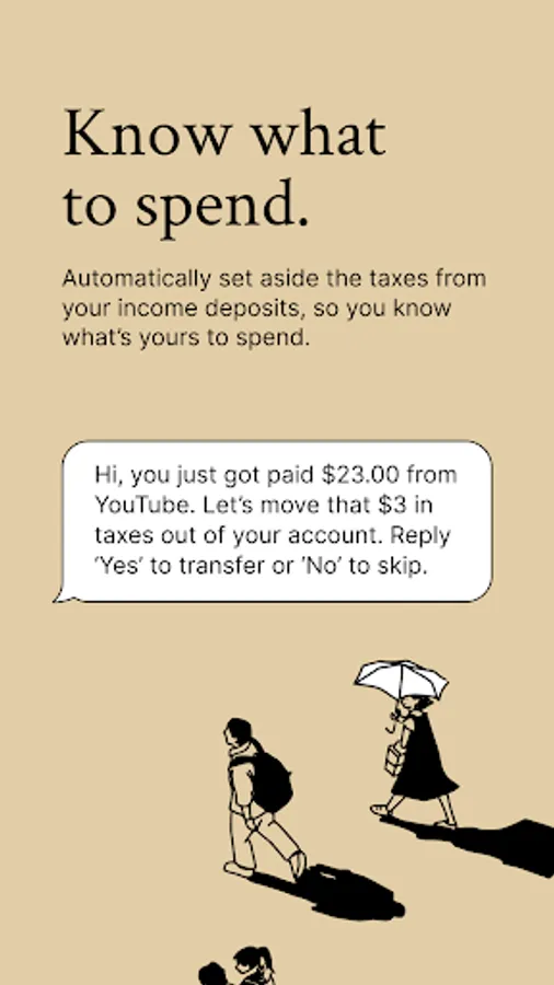 Taxes Covered - We run the calculations based on your profile and help you set money aside in a dedicated account in your name. All it takes is a text.