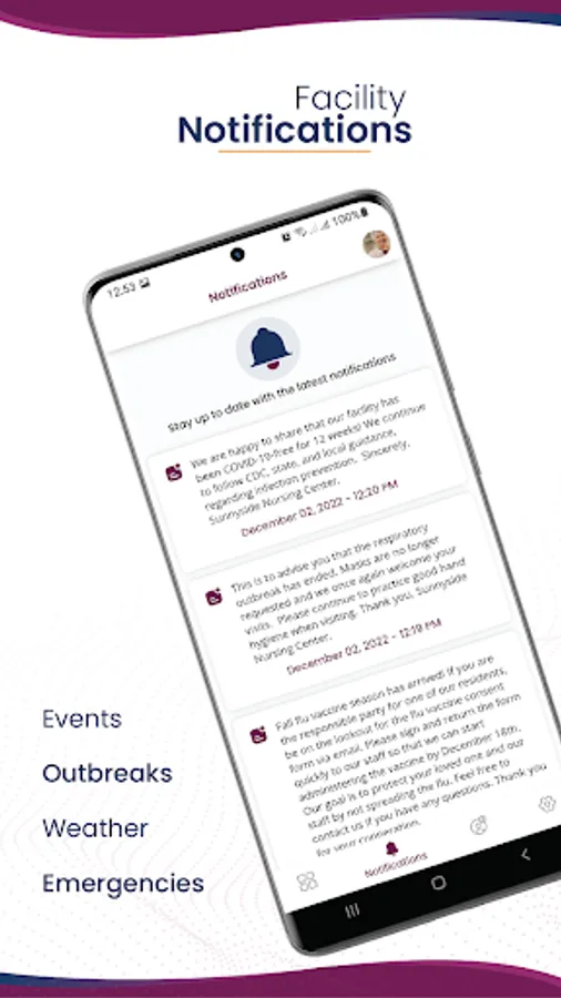 Facility Notifications - Unpredictable weather and emergency situations can happen. With How's Mom, family members are sent notifications from the care center via the app.