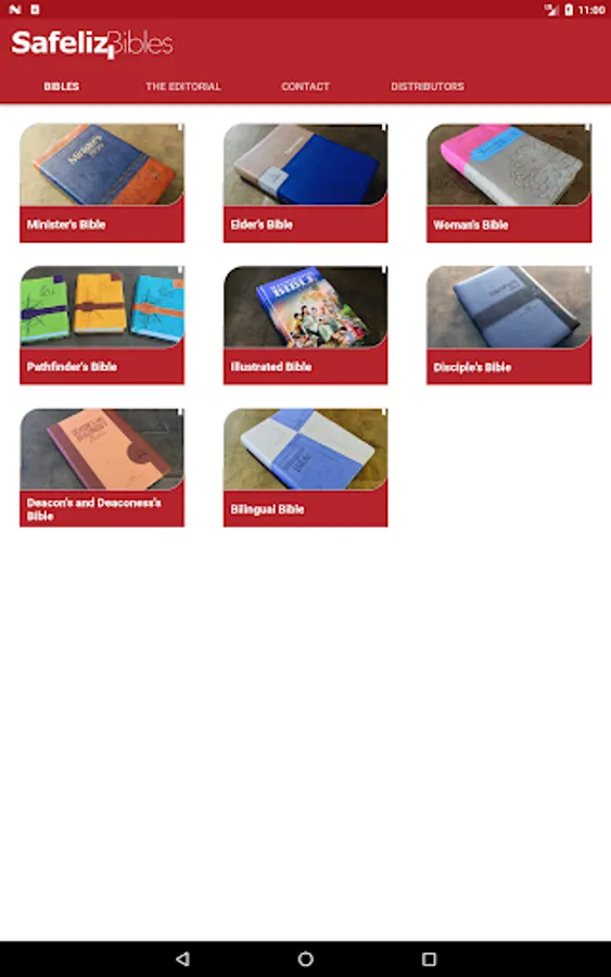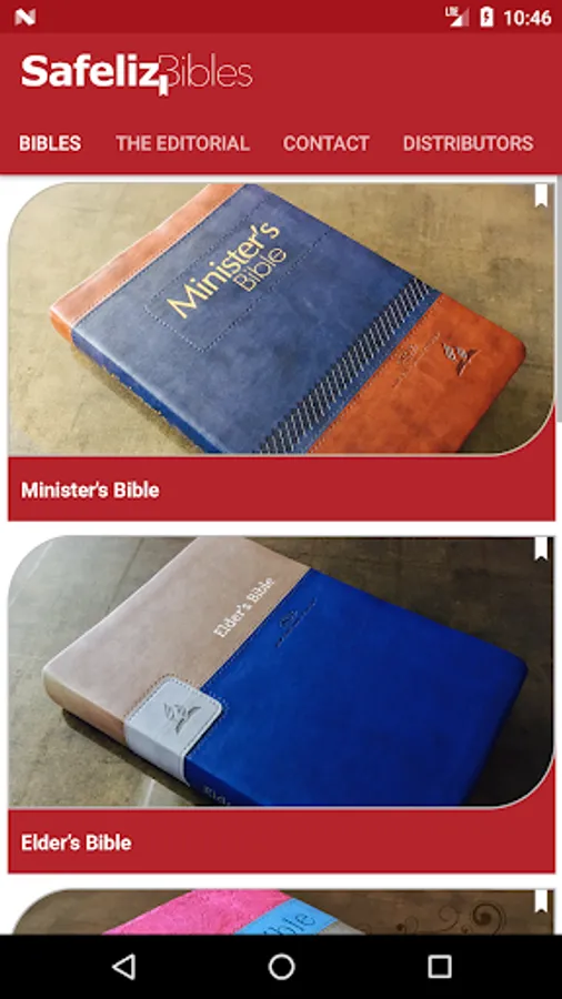 App Safeliz Bibles allows to see all the Bible editions published by Safeliz in cooperation with the General Conference of the Seventh-day Adventist Church. Discover their colors, covers, and additional resources. Available in three languages: Spanish, English, and French. You will be able to see images of each one of the Scripture presentations, and a gallery of photos of the tables and the inside content. Find all the information about the Woman's Bible, Pathfinder Bible, Elder's Bible, Deacon's and Deaconess's Bible, Disciple's Bible, Bilingual Bible, and more. Know our distributors around the world.