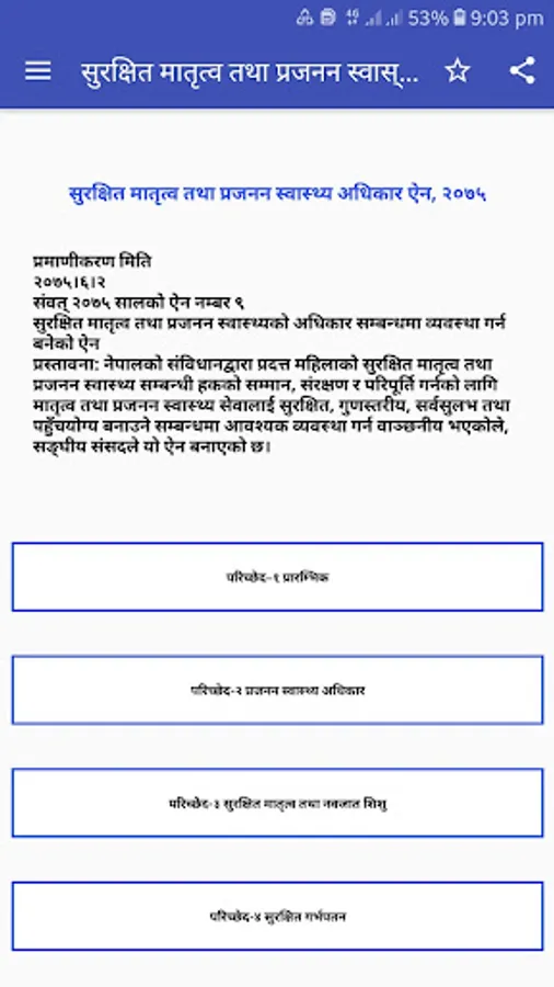 This App provide Law and Act of Nepal Regarding Right to Safe Maternity and Reproductive Health Act. (सुरक्षित मातृत्व तथा प्रजनन स्वास्थ्य अधिकार ऐन, २०७५)