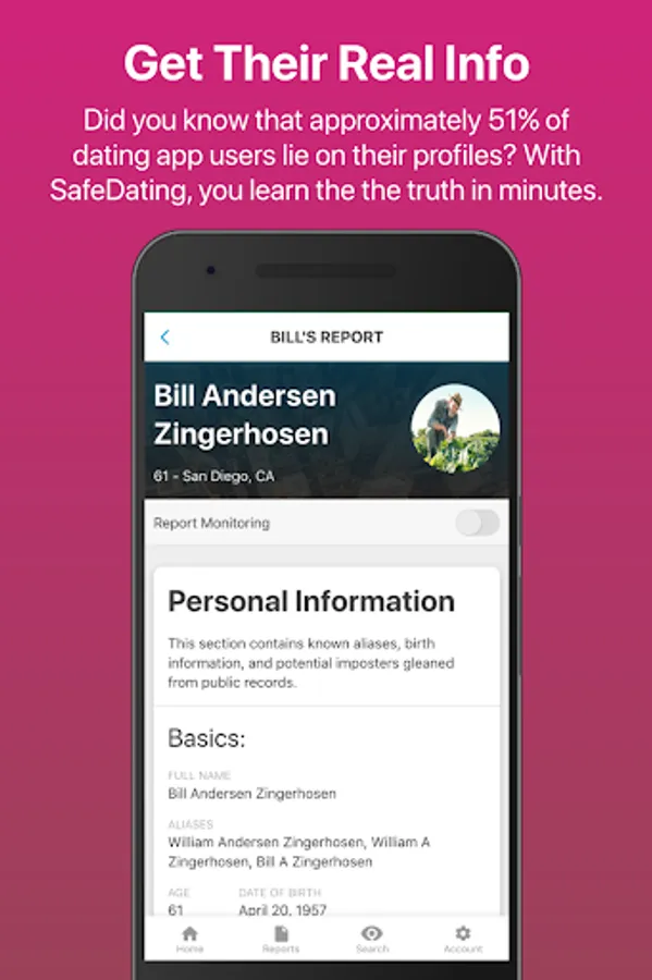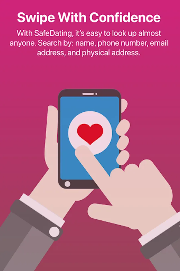 Say “goodbye” to creepers, cheaters, and catfishes! SafeDating is your essential tool for background checks for dating apps. The majority of dating profiles are packed with lies. Wouldn’t you like to know the truth? From Bumble to the bar, you can background check almost anyone on the go.
