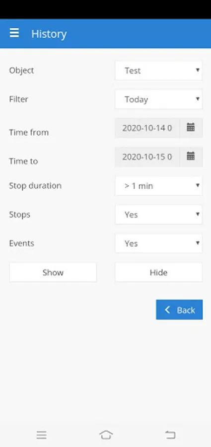 History and Reports - Preview or download reports. It can include various information: driving hours, stopovers, distance traveled, fuel consumption etc.