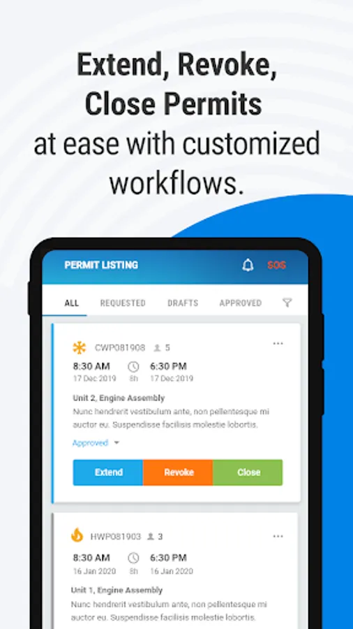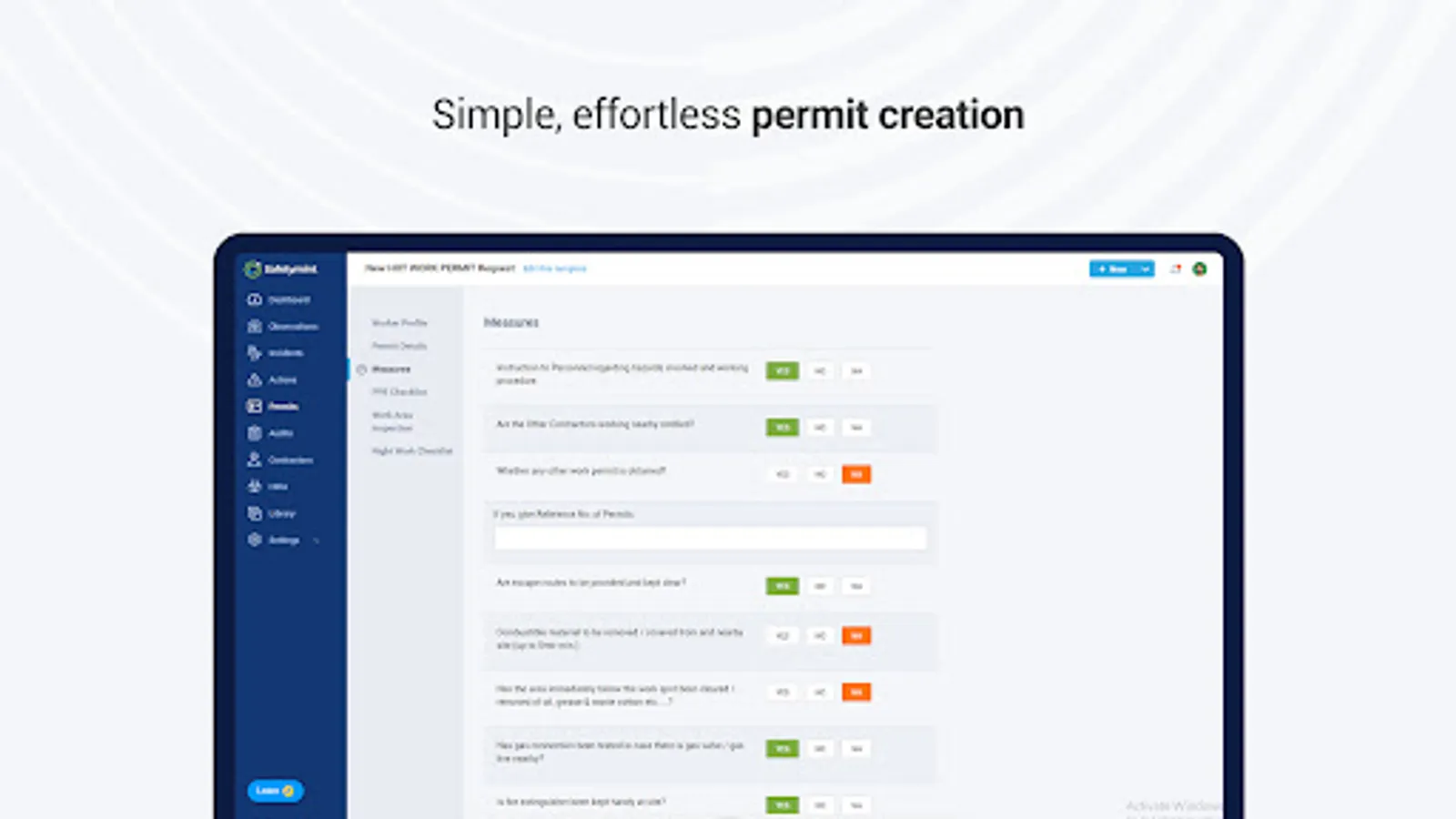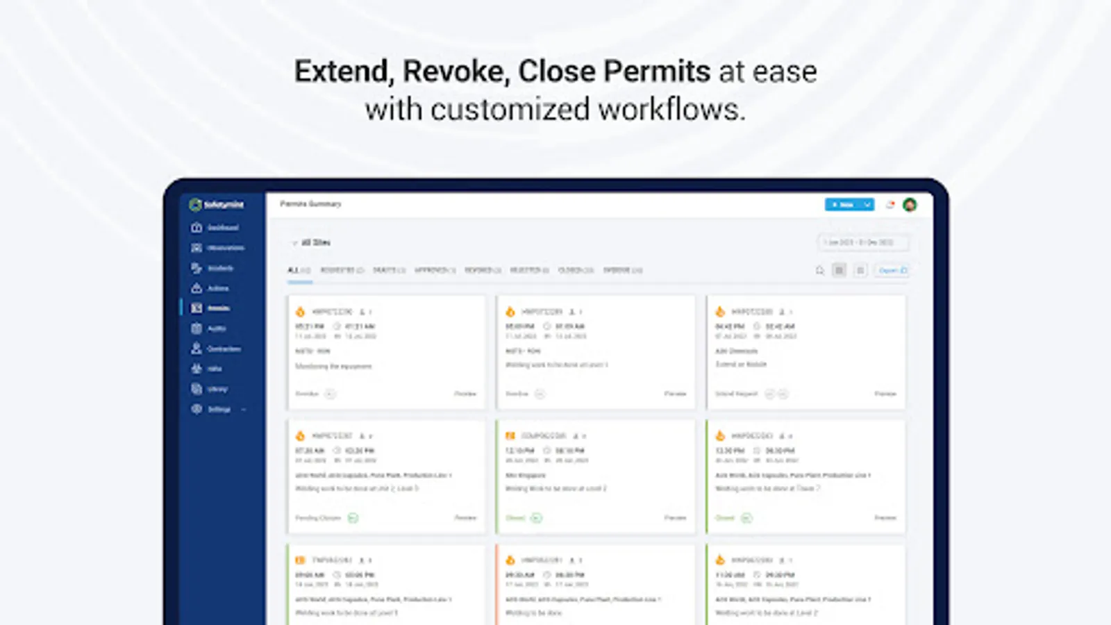 Safetymint Permit to Work System helps you request, issue, revoke, extend or close permits of all types within minutes. Available on desktop and mobile, Safetymint ePTW app can help mitigate risk, foster teamwork and effectively control work operations from start to finish in a few clicks.