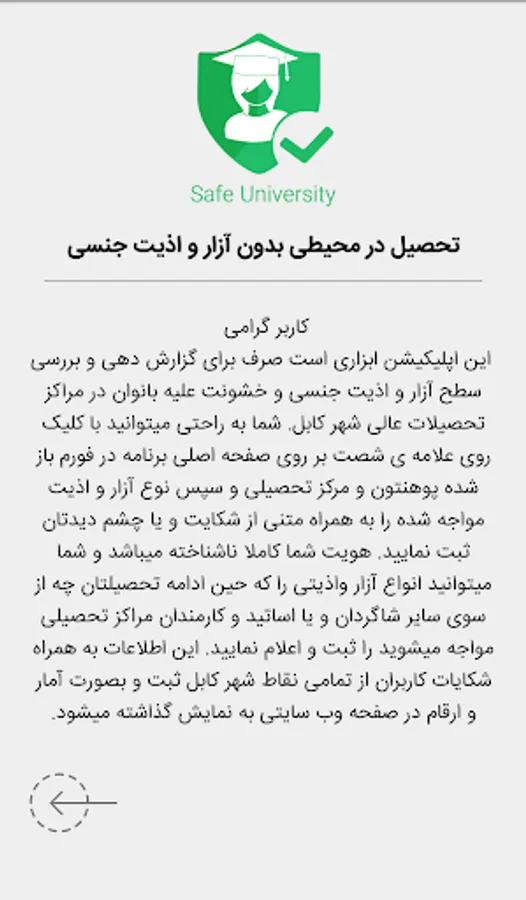 Safe University is a mobile application and tool in your hands to report sexual harassment you faced in universities in all around the kabul city, this harassments may have some types like touching, mistreat,chivvy and etc from other male students or from some teachers. you should feel free to use this application and report and register your complaints.