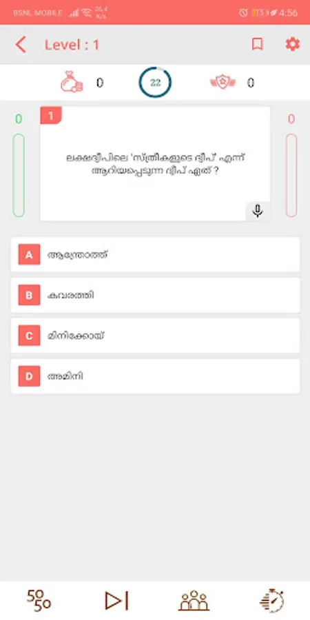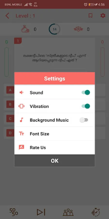 * 50-50 : for remove two option out of Four (deduct 4 Coins)