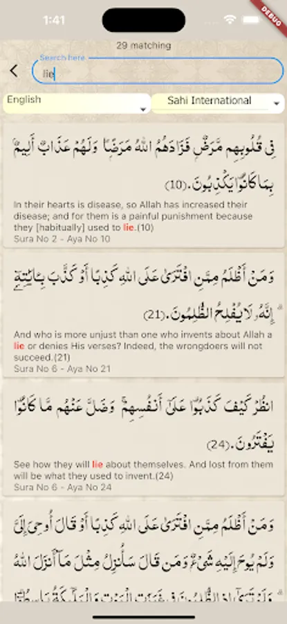 in Typing search you can type any word from any language and App will search that word in whole Quran and will return results of verses includes that word.
