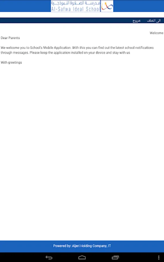 من خلال هذا التطبيق سيتم إرسال رسائل تخص ابنائنا الطلبة من قبل إدارة المدرسة لأولياء الأمور وهذا التطبيق بدلا عن الرسائل القصيرة.
