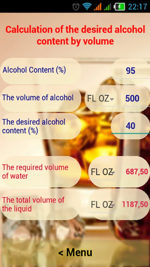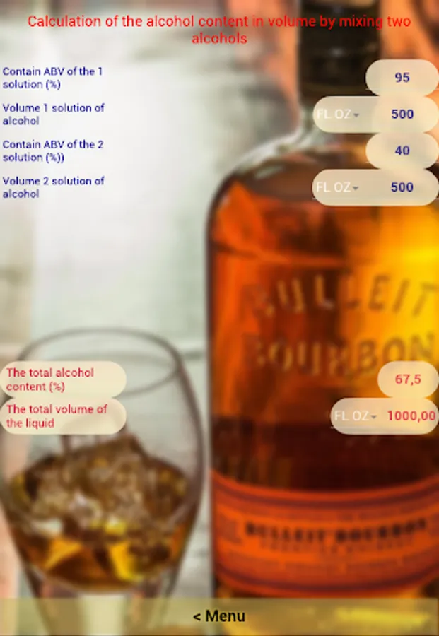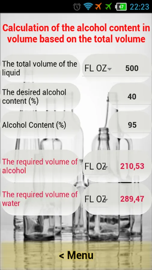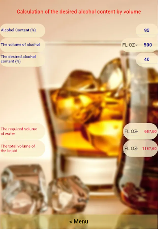 Use the Alco calculator to determine the required amount of water. The program has a few calculations. Simply enter the fortress of the starting alcohol in a percentage (e.g., 98), the amount of the starting alcohol and the desired strength of alcohol to be obtained in total (for example, 40 - this corresponds to the strength of vodka, or 70, this corresponds to fort an alcohol-containing solution required for the preparation of some sort of fruit liqueurs). There is no need to press the calculation (it is not!), Maybe the calculation is done automatically when you change any given initial parameters. Download the program to your tablet or smartphone, and it will always be at hand. There is no need to go online and look for online calculator.