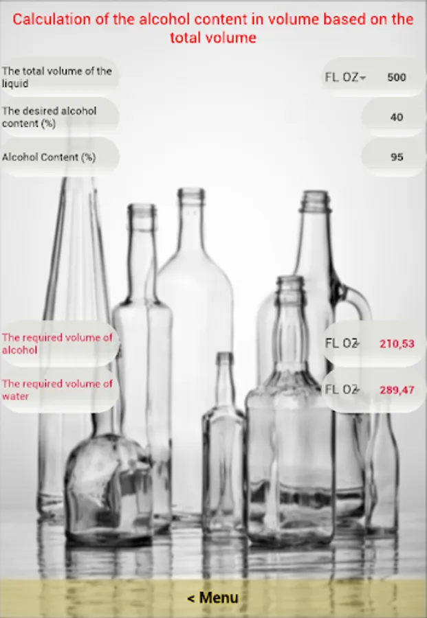 3) Calculation based on the alcohol content of the final volume (Knowing the volume of the solution of alcohol that you want to receive, count the number of alcohol-containing solution, and water)