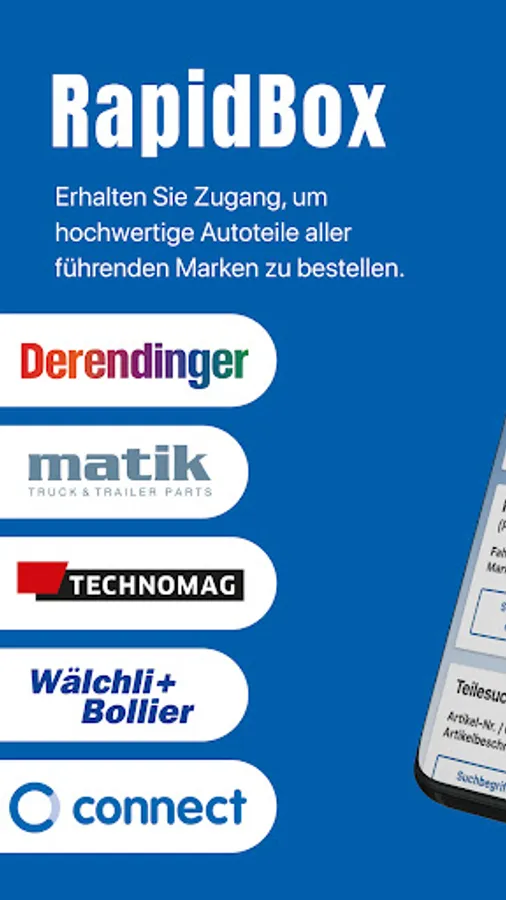 Are you a customer of Derendinger, Matik, Technomag or Wälchli & Bollier? Then you can now use our online shop on your smartphone. Simplify your shop's purchasing process with RapidBox, the ultimate app designed specifically for your auto repair shop. Here you will find all our webshops in one app. Access our extensive stock of auto parts from all leading brands, use our efficient vehicle selection and our unique VIN search. You can either use our VIN scanner or enter your customer's VIN manually - all in one convenient platform.