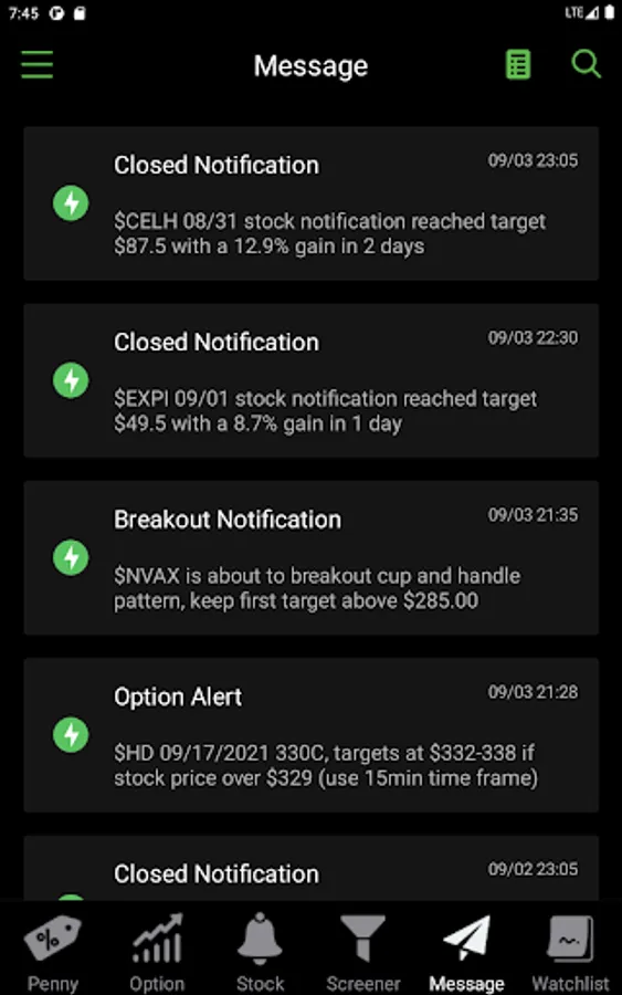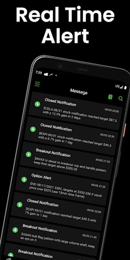 Receive real time stock alerts through notification center, include breakout, pattern, pullback, long term, swing trade, day trade set up ideas, help you pick the best stocks to buy and sell today. All notification and alert include target and technical analysis reasons.