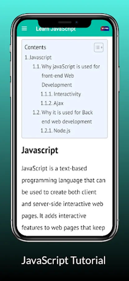 This amazing JavaScript Programming Learning app has amazing content such as JavaScript Programming Tutorials, JavaScript Programming Lessons, Programs, Questions & Answers and all that you need to either learn JavaScript programming basics or to become a JavaScript programming expert.