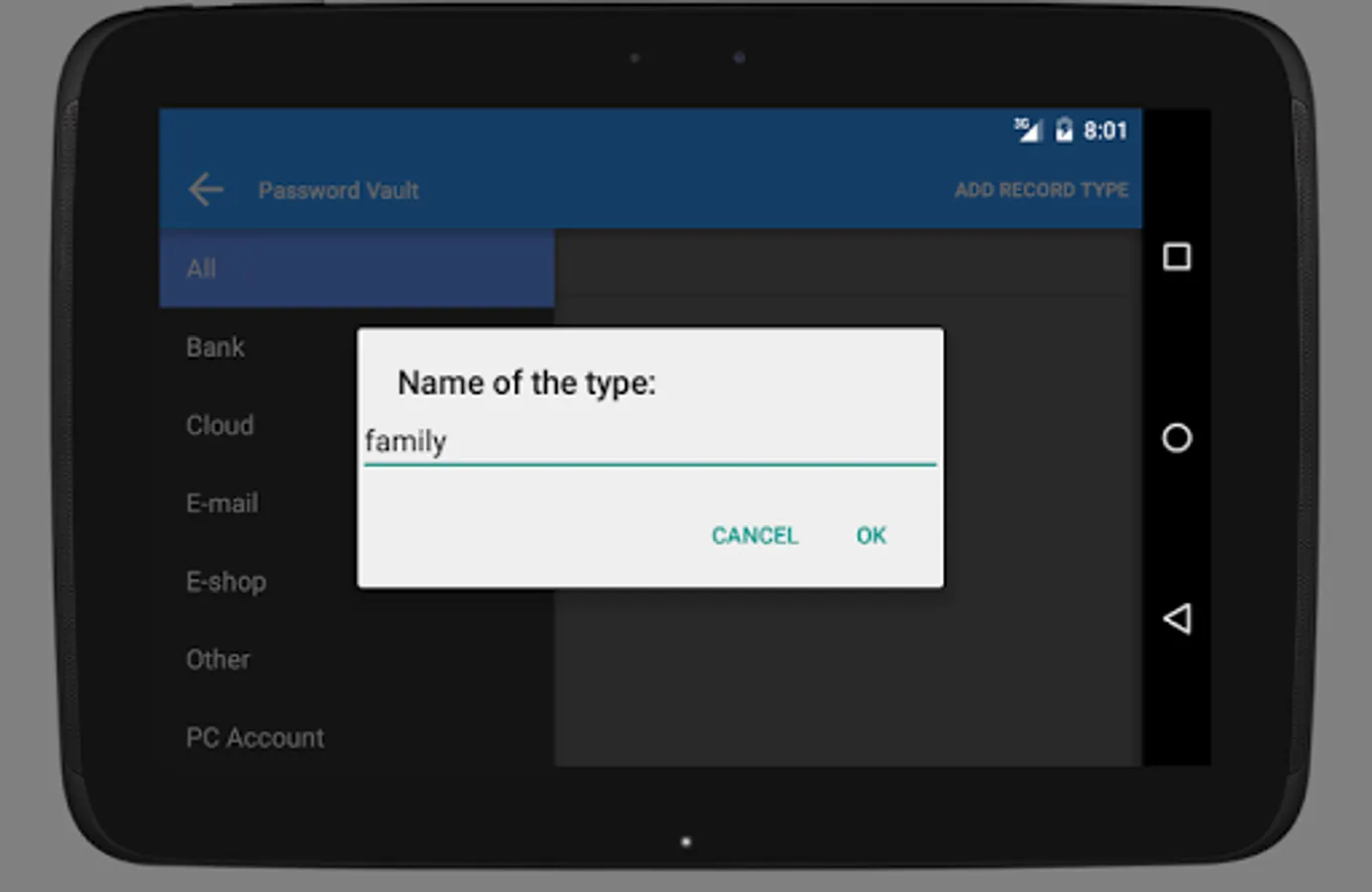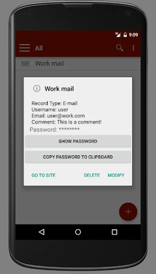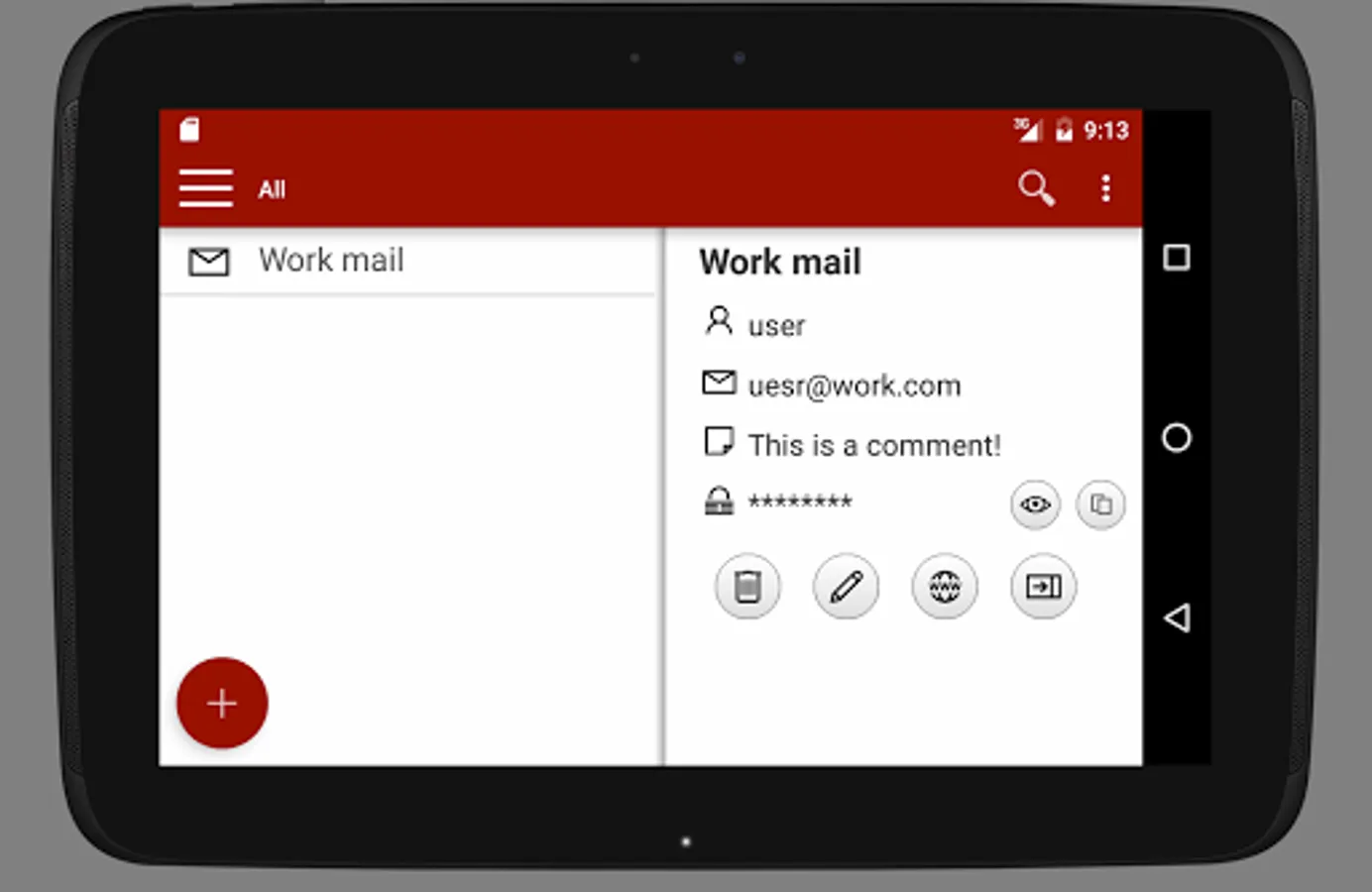 Simple Password Vault can help you store the usernames, emails and passwords that you use when signing in to different sites, bank accounts, PC etc. This application does not communicate with the network, so your data will always stay in your mobile device only. All passwords are encrypted and only the application can have access to them. A password generator is included, this way you can generate and store strong passwords. You can export all your data to a .csv file for back up purposes. The back up files can be later imported, for example if you move to a new device.