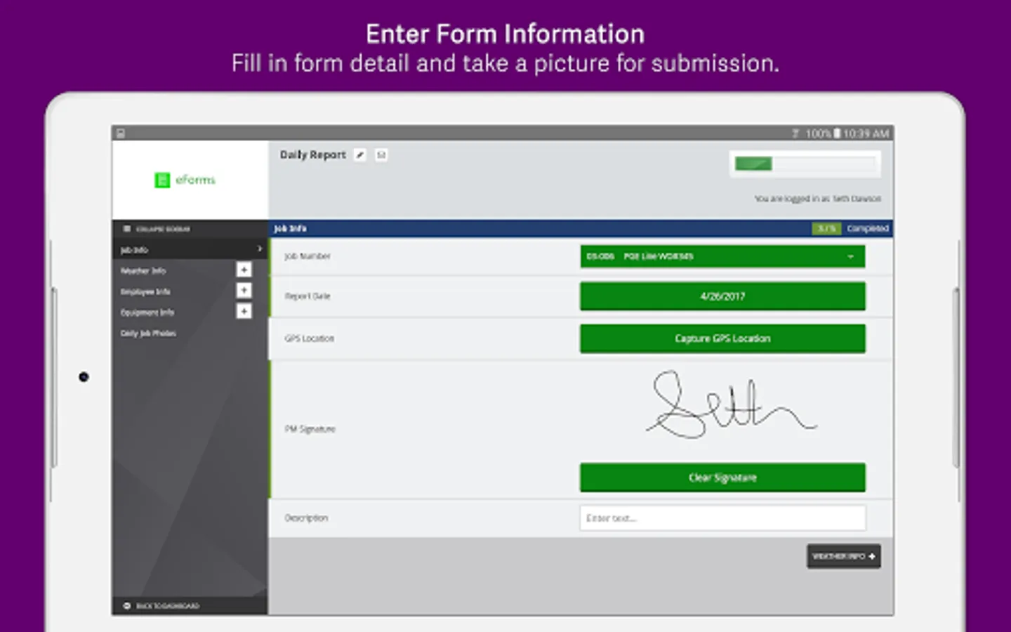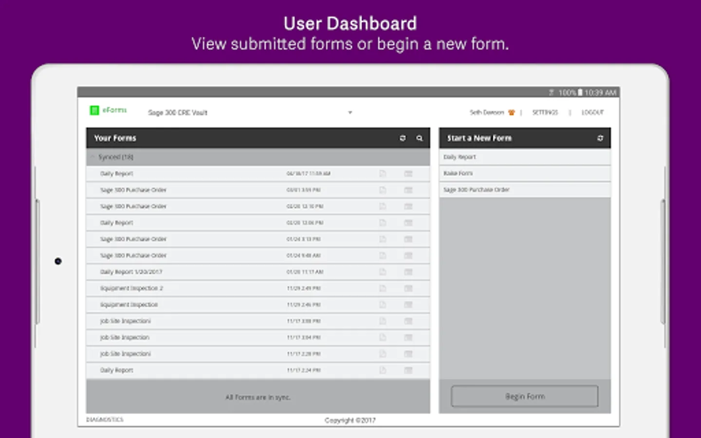 Replace your stacks of paper forms by publishing your forms to users in the field with eForms. With an easy to use management website, configure and publish any form to tablets in the field. Capture data and photos directly from the field and submit them instantly to your SPC server for instant storage and/ or routing. Map your forms to SPC document types and index values. Web services allow users in the field to have full lookup lists of jobs, equipment, vendors, employees, etc., straight from your Sage 100 Contractor or Sage 300 CRE databases. Users can route between themselves, for collaboration, before submitting back to your SPC server. Capture the following: Published items (Job #'s, Vendors, etc.), Text, Dates, Time, GPS locations, Signatures, Photos or anything you want to submit back to the Sage Paperless Construction application.