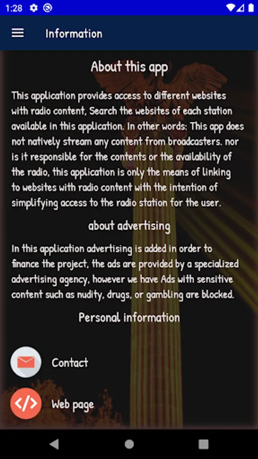 In other words: this application does not natively transmit any content from radio stations, nor is it responsible for the content or availability of the radio, this application is only the means of linking to websites with radio content with the intention to simplify the user's access to the radio station.