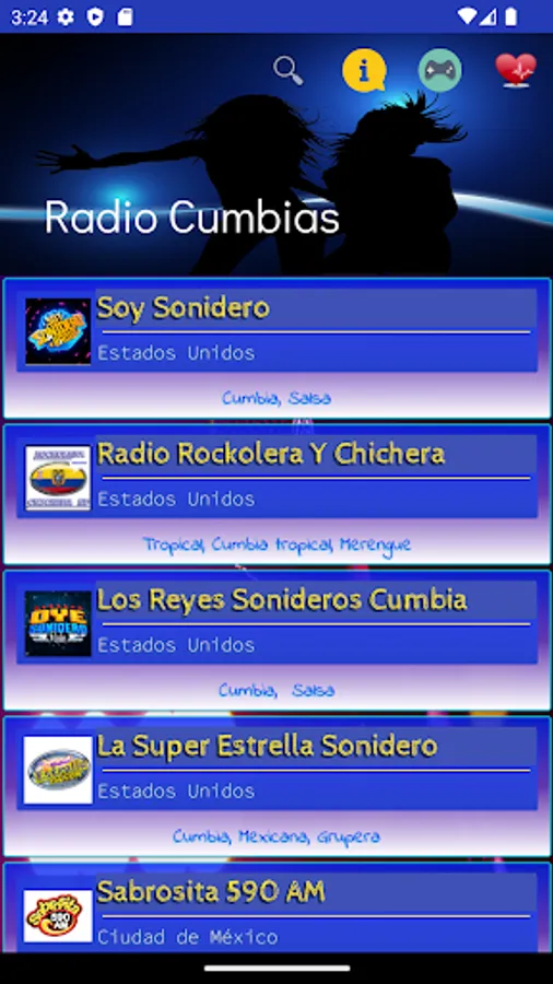 In this application you can find a great variety of radio stations, corresponding to the musical genre "Cumbia".