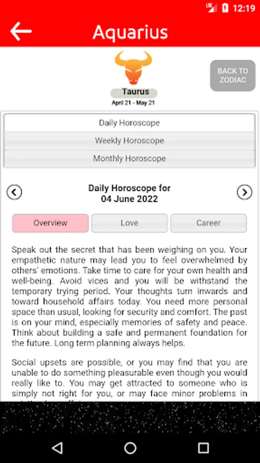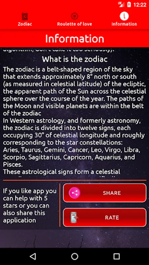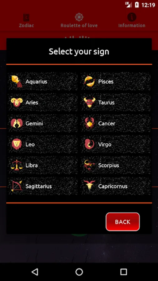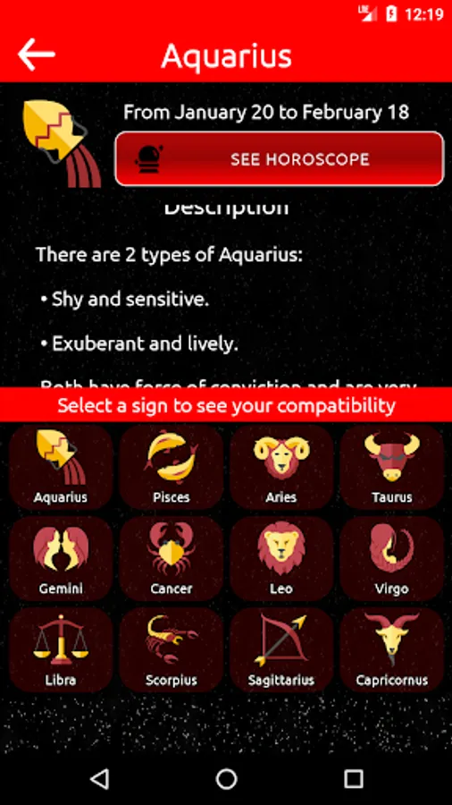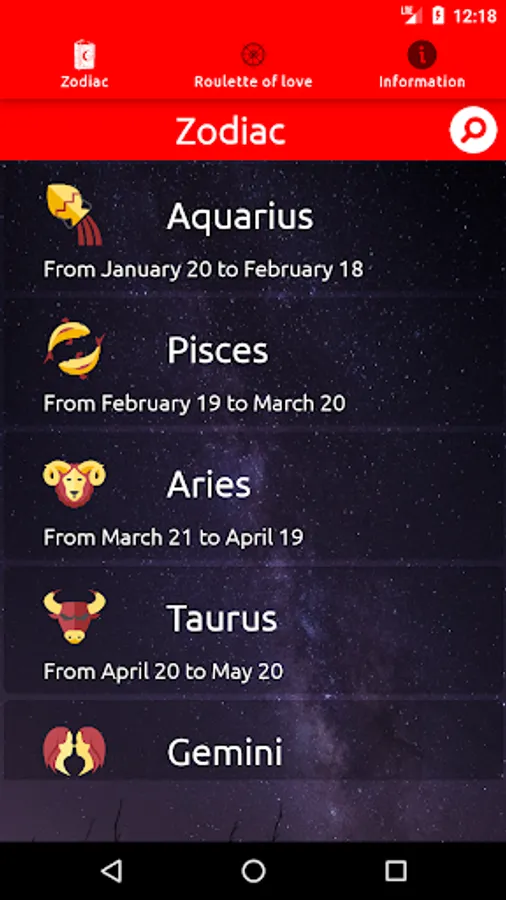 With this application you will be able to read your horoscope daily, you will also find all the information about your zodiacal sign and you will know the compatibility that you have between the different Zodiacal Signs.