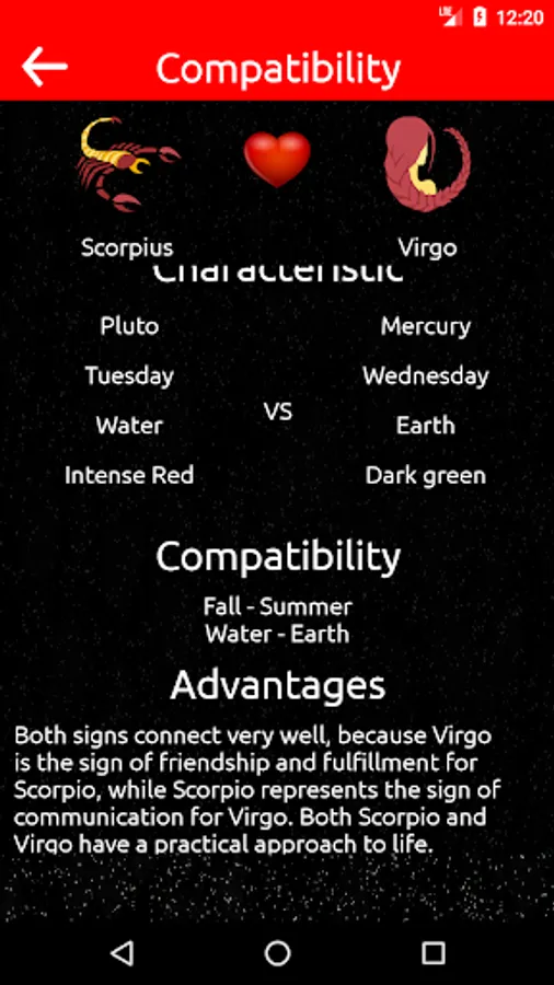 Here you will find a description about compatibility in love and relationship, you just have to ask for the zodiac signs of your preference and you will see the advantages, disadvantages, intimacy and you will be able to know elements, day of the week, star and much more