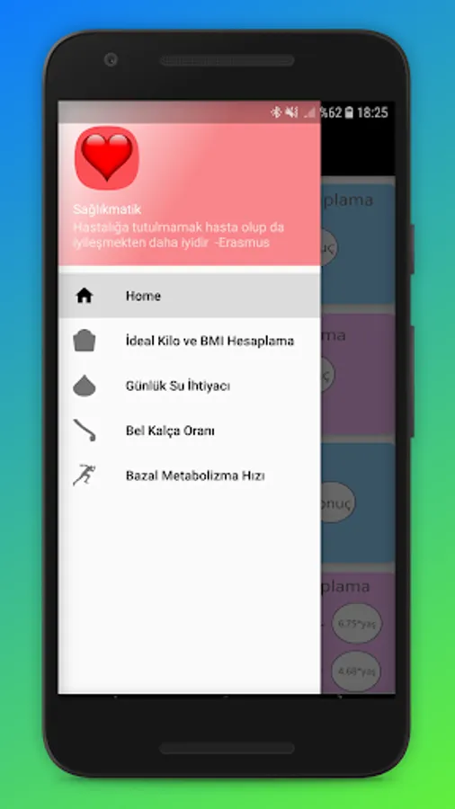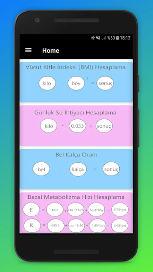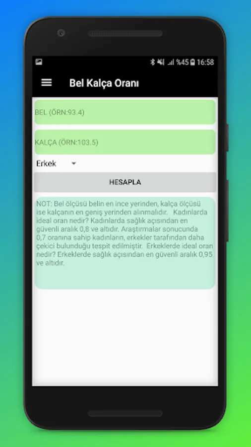 With Sağlıkmatik, you can easily find out your Ideal Weight, Body Mass Index, Daily Water Need, Waist to Hip Ratio and Basal Metabolic Rate.