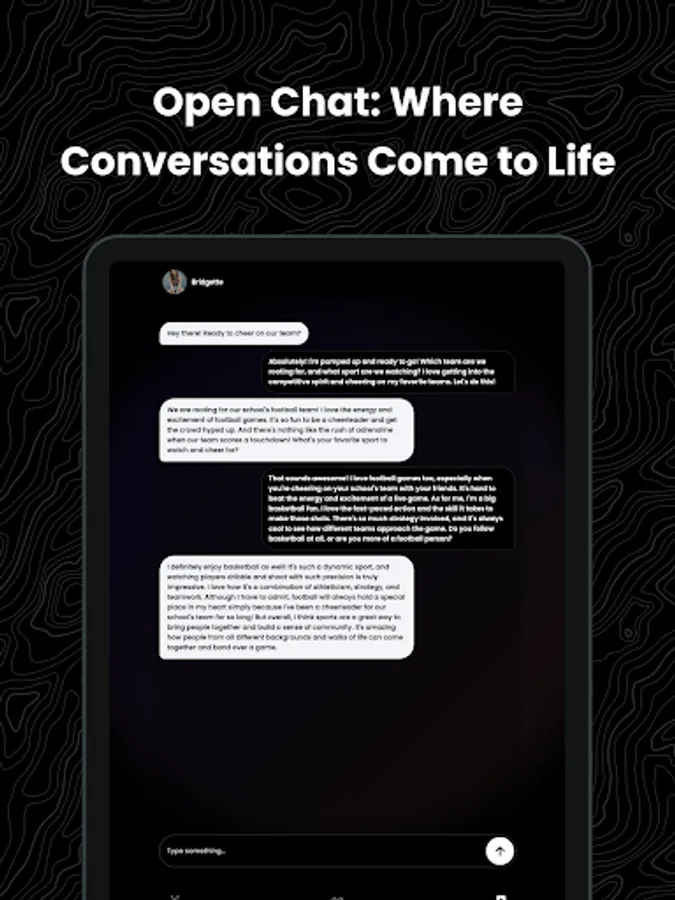 With Open Chat, the possibilities are endless. Discover new perspectives, expand your horizons, and make meaningful connections in a safe and interactive environment. Whether you're seeking intellectual stimulation, emotional support, or simply a friendly conversation, our AI characters are ready to engage and entertain you.