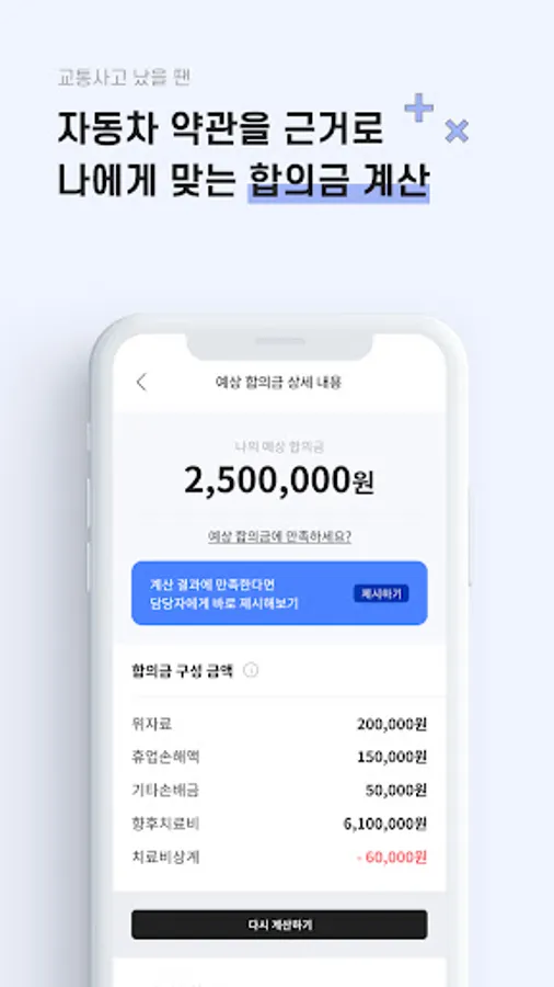 ※ In Accident Link, through more than 250,000 cases of data, you can find out the settlement amount from the perspective of a traffic accident victim, not from the point of view of an insurance company, and compare it with the calculations of other people who have suffered similar accidents and similar damage.